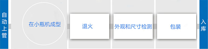 從玻璃管生產(chǎn)出來之后,通過輸送鏈單根輸送到制瓶車間,再通過機(jī)器手插到機(jī)器上開始進(jìn)行生產(chǎn)。然后進(jìn)入遠(yuǎn)紅外線電退火爐退火后,再進(jìn)入在線攝像機(jī)檢測系統(tǒng)進(jìn)行檢測,然后包裝入庫。