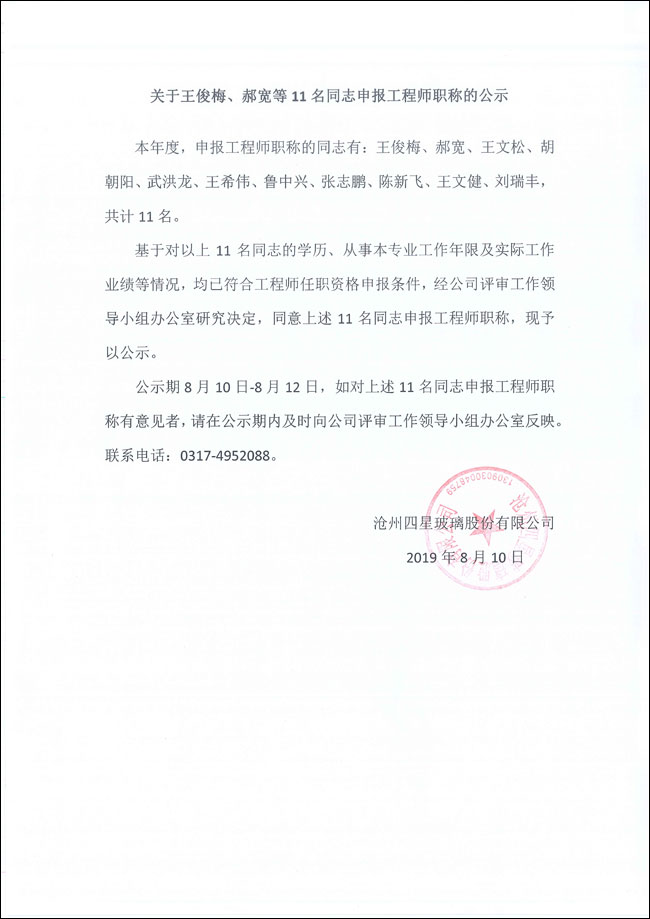 關(guān)于王俊梅、郝寬等11名同志申報工程師職稱的公示